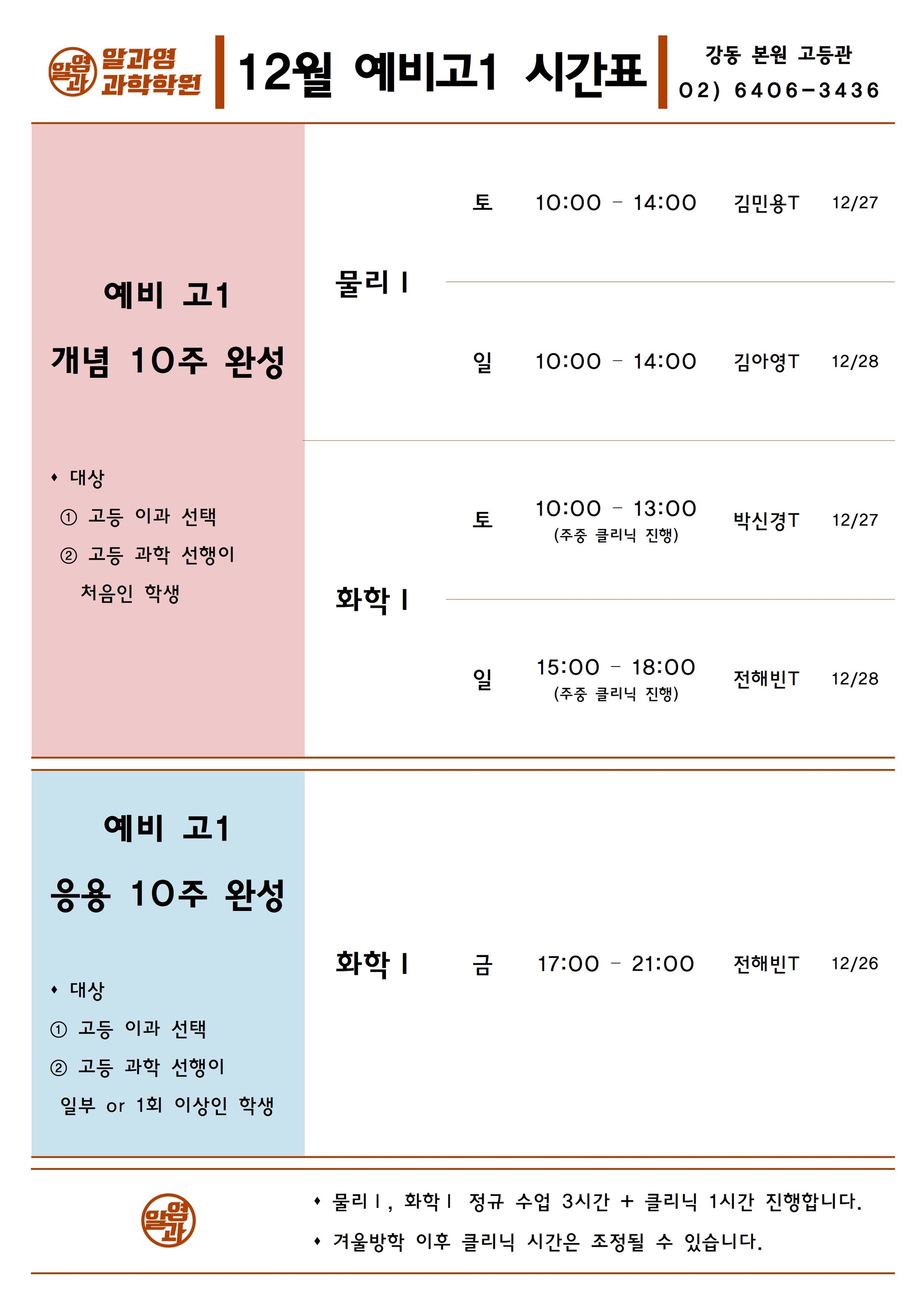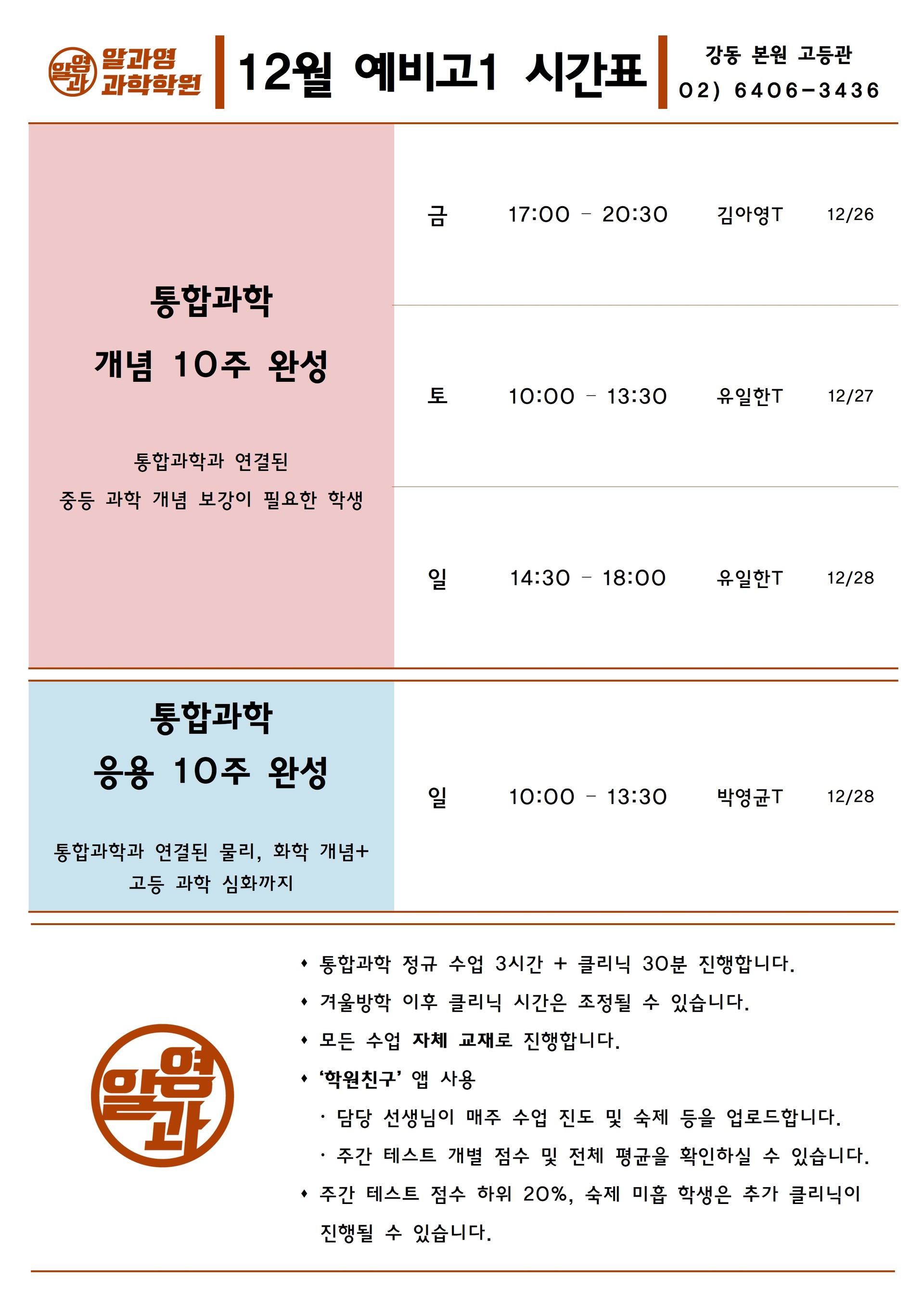 알과영 학원 시간표 12월 예비고1