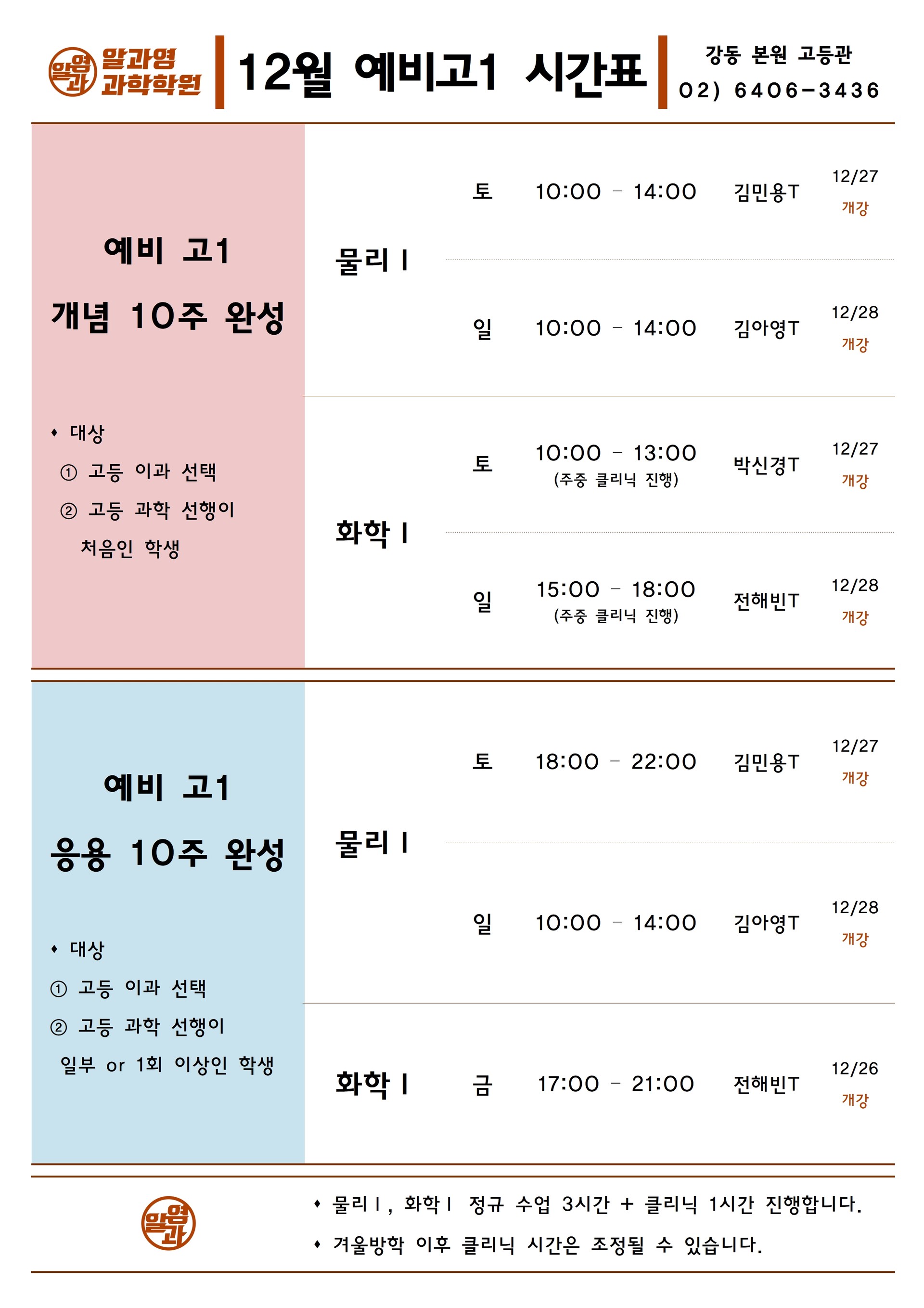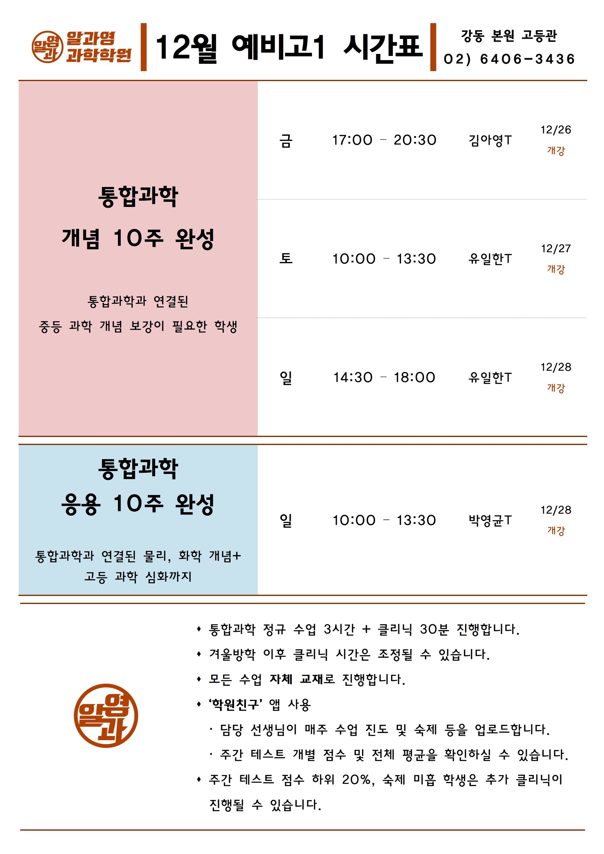 알과영 학원 시간표 12월 예비고1